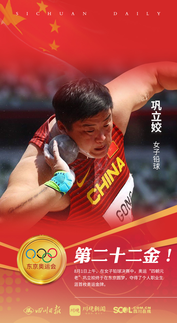 8月1日上午,在女子铅球决赛中,奥运“四朝元老”巩立姣终于在东京圆梦,夺得了个人职业生涯首枚奥运金牌。这也是中国代表团在东京奥运会的第22金!