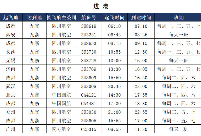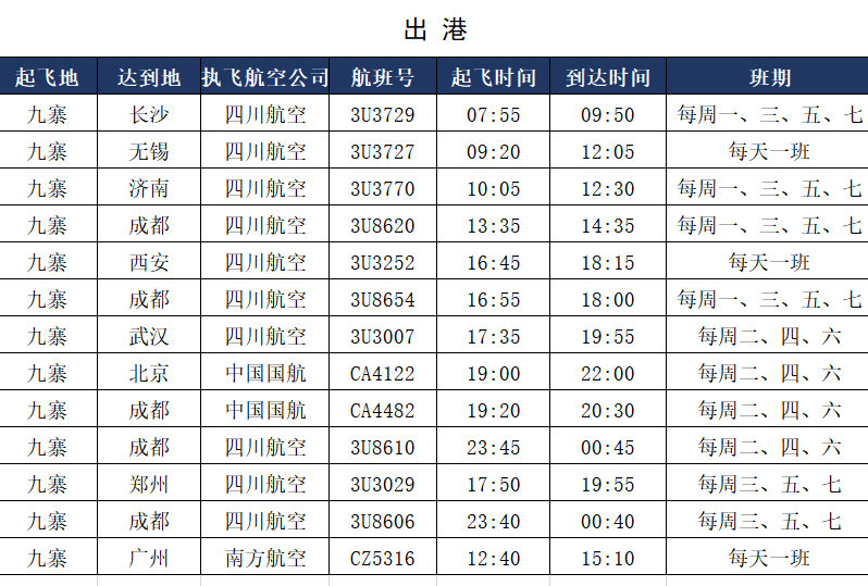 该航线由南方航空公司采用空客A319机型执飞,每天一班。具体航班时刻为:广州-九寨航段CZ5315次航班08:55由广州白云国际机场起飞,11:30抵达九寨黄龙机场;九寨-广州航段CZ5316次航班12:40由九寨黄龙机场起飞,15:10抵达广州白云国际机场。单程飞行时长约2小时35分钟,经济舱机票全价1940元。