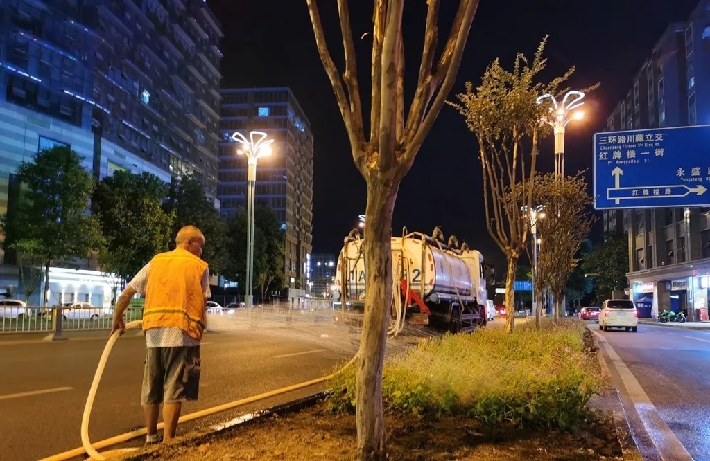 四川在线记者了解到,高温天气下,武侯区公园城市局不仅将种花时间调整至夜间,还把浇水时间定为上午8点以前和傍晚19点半以后,通过人车结合,以人工拉管浇水及水车喷淋的方式对管护路段绿地、绿篱因地制宜进行错时灌溉,防止绿植“中暑”。