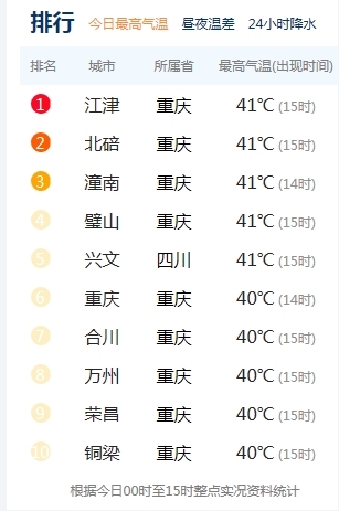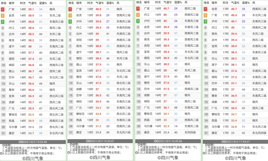 就说今天,8月3日,全省各地先后发出22个高温红色预警信号(高温橙色预警太多,且忽略了~)。一个标志性事件是,四川兴文冲上了全国高温排行榜,并且位居第5名。
