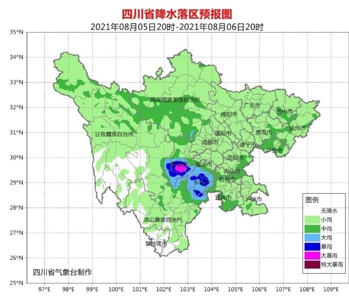 8月5日晚上到6日白天,雅安、眉山、乐山3市有中到大雨,局部暴雨或大暴雨;甘孜州北部、阿坝州南部和凉山州东北部有中雨。
