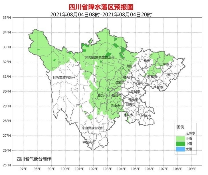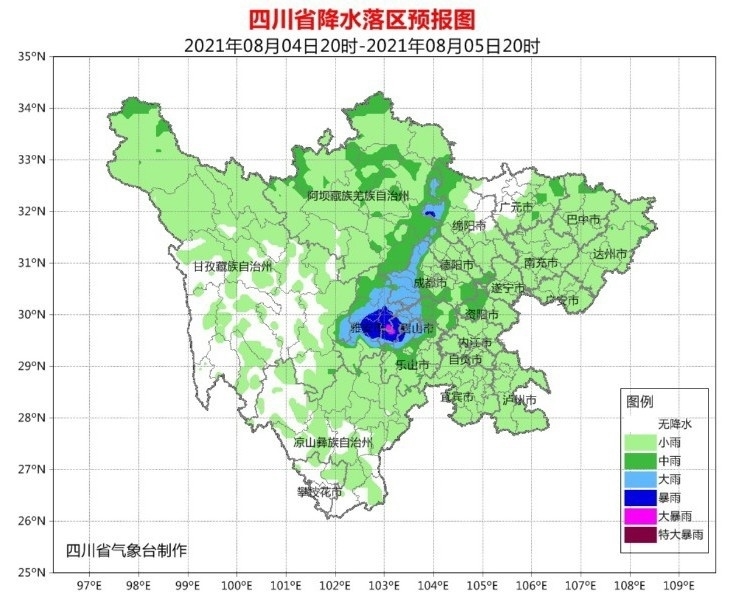 四川省气象台预计,8月4日晚上到5日白天,成都、雅安、眉山、乐山、资阳5市及盆地西北部沿山有中到大雨,雅安、眉山、乐山3市局部有暴雨或大暴雨;阿坝州北部东部有中雨。