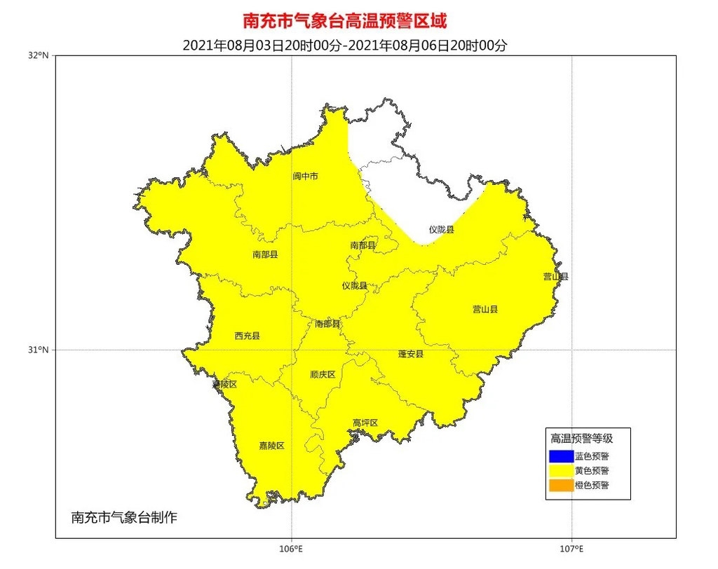 8月3日16时,南充市气象台继续发布高温黄色预警。8月3日20时到5日20时,南充市各县(市、区)日最高气温将达36至38℃,午后到傍晚不稳定能量较高,有分散性雷雨或阵雨,局部伴有短时强降水、阵性大风等对流性天气。特别提醒市民、各部门做好防暑降温和局地对流性天气的防范工作。