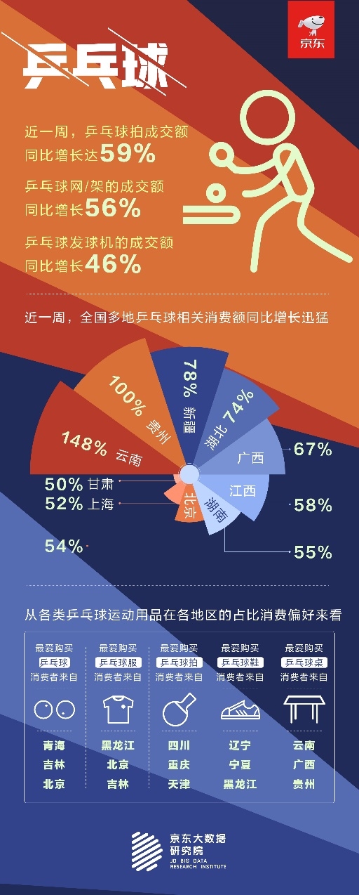8月3日,四川在线记者从京东商城获悉,作为中国“国球”,乒乓球多年来一直是国民运动的热门选项。近一周,乒乓球拍成交额同比增长达59%,乒乓球网/架的成交额同比增长56%,乒乓球发球机的成交额同比增长46%。
