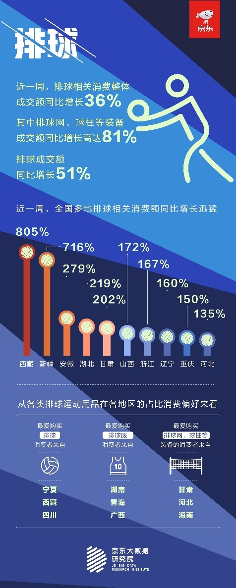 排球对于中国人来说别具意义,在“中国女排精神”的引领下,很多人爱上了这项运动。据京东大数据显示,近一周排球相关消费整体成交额同比增长36%,其中排球网、球柱等装备成交额同比增长高达81%,排球成交额同比增长51%。与此同时,全国多地排球相关消费额同比增长迅猛,西藏成交额同比增长805%;新疆同比增长716%;安徽同比增长279%;湖北增长219%。而从各类排球运动用品在各地区的占比消费偏好来看,最爱购买排球的消费者来自宁夏、西藏、四川。