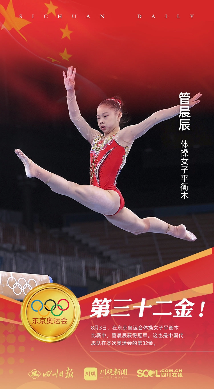 在东京奥运会体操项目最后一个比赛日最后一个项目——女子平衡木比赛中,中国16岁小将管晨辰以14.633分夺得冠军,这是中国体育代表团在本届奥运会的第32枚金牌。联手出战的唐茜靖以14.233分获得银牌。这是管晨辰首次站在奥运会的赛场,她也成功帮助中国体操拿到东京奥运会第3金。