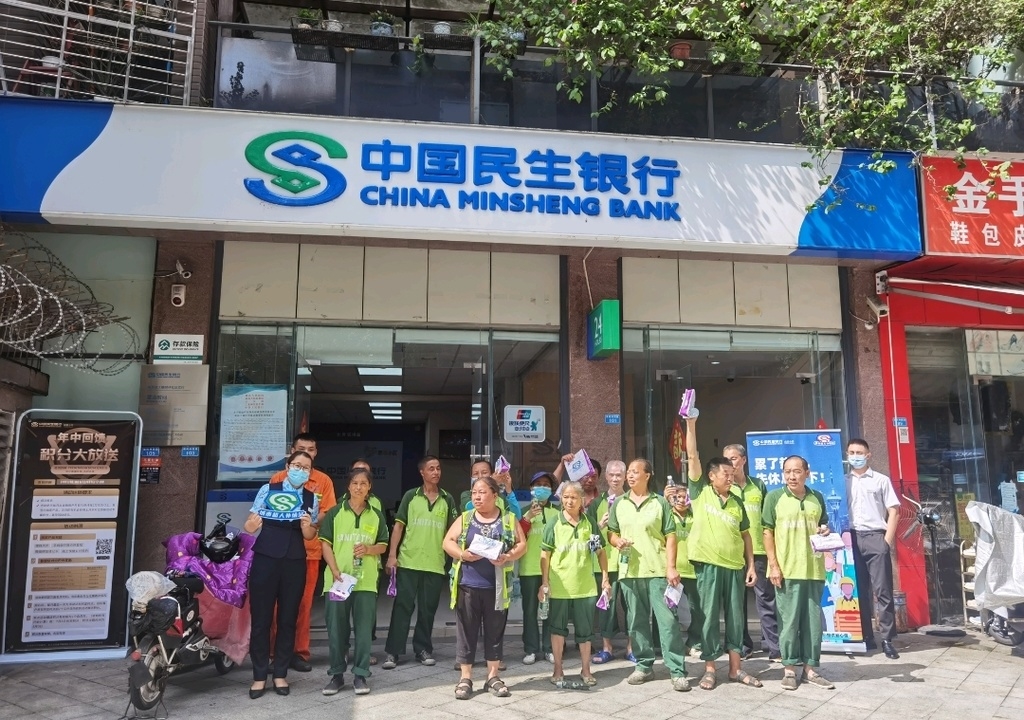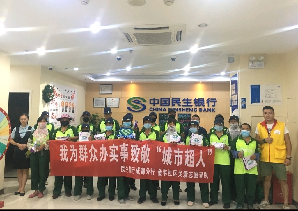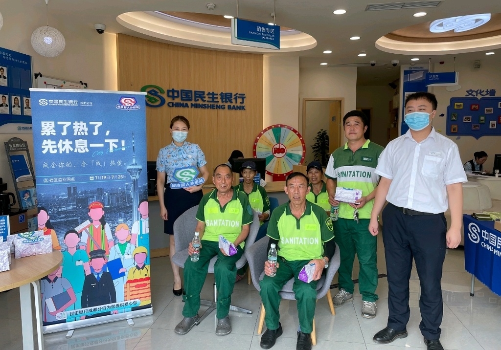 民生银行成都分行按照成都东、西、南、北及周边县域,以及德阳、宜宾、巴中等市州划分活动范围,积极开展这项公益活动。该行各分支行、各网点积极响应,为周边的“城市超人”们送去爱心包,并致谢他们在烈日下的坚守。如成都东片区网点组织青年员工将水和糕点配送给网点附近的环卫工人和交警,邀请他们每日来网点领取爱心包、喝水、休息,并介绍一些防诈骗、金融小知识,短短4天为近700多位社会服务人员送去了夏日关怀。而在神仙树支行的厅堂外,摆放着活动宣传海报,并张贴了“城市超人徽章”,员工们为辛勤劳作的环卫工人发放了“爱心包”。