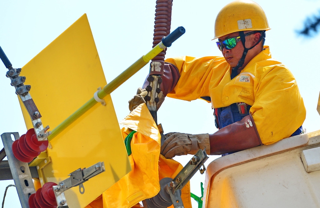 ▲都江堰供电公司对35千伏西崇线检修处理缺陷,争分夺秒恢复供电。