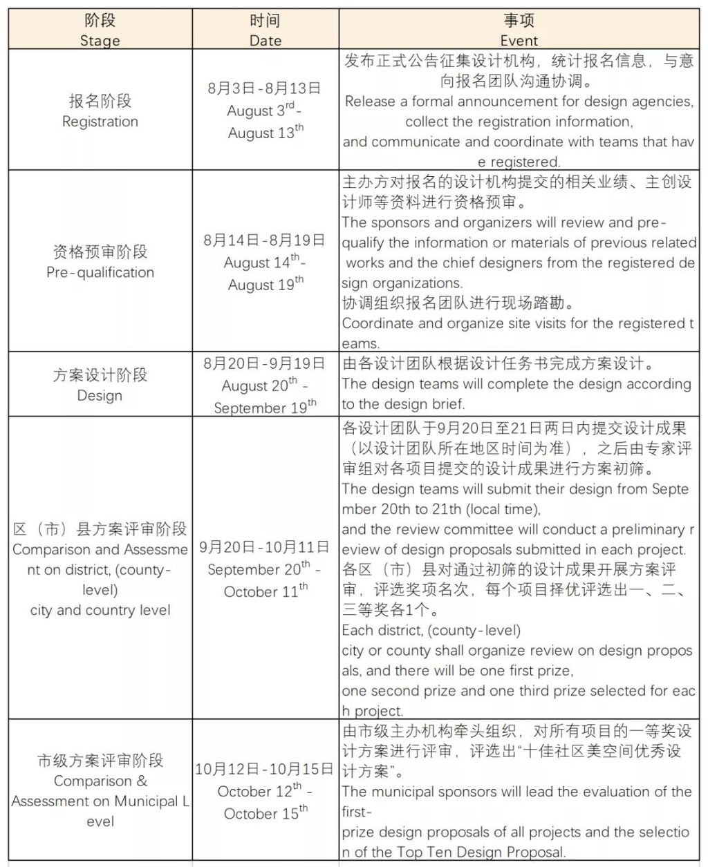 据悉,即日起至8月13日为活动报名阶段,活动将发布正式公告征集设计机构,统计报名信息,与意向报名团队沟通协调。8月14日至8月19日为资格预审阶段,主办方将对报名的设计机构提交的相关业绩、主创设计师等资料进行资格预审,协调组织报名团队进行现场踏勘。8月20日至9月19日为方案设计阶段,由各设计团队根据设计任务书完成方案设计。9月20日至10月11日为区(市)县方案评审阶段,各设计团队于这两日内提交设计成果(以设计团队所在地区时间为准),之后由专家评审组对各项目提交的设计成果进行方案初筛;各区(市)县对通过初筛的设计成果开展方案评审,评选奖项名次,每个项目择优评选出一、二、三等奖各1个。10月12日至10月15日为市级方案评审阶段,由市级主办机构牵头组织,对所有项目的一等奖设计方案进行评审,评选出“十佳社区美空间优秀设计方案”。
