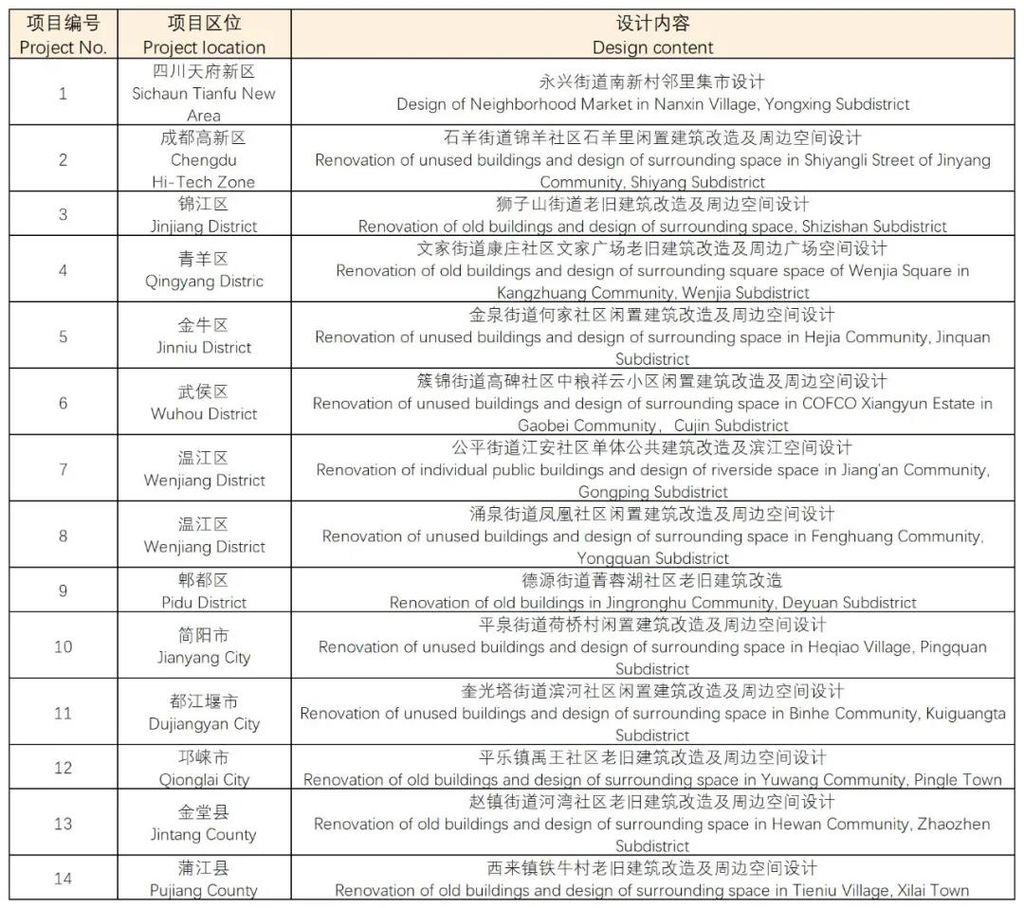 本次活动旨在为成都市14个具备创意设计潜质和美学应用价值的社区空间进行概念方案设计。项目类型主要为老旧建筑改造及周边空间整体打造、空间功能提升与闲置空间再利用,各点位项目清单如下(图片)。