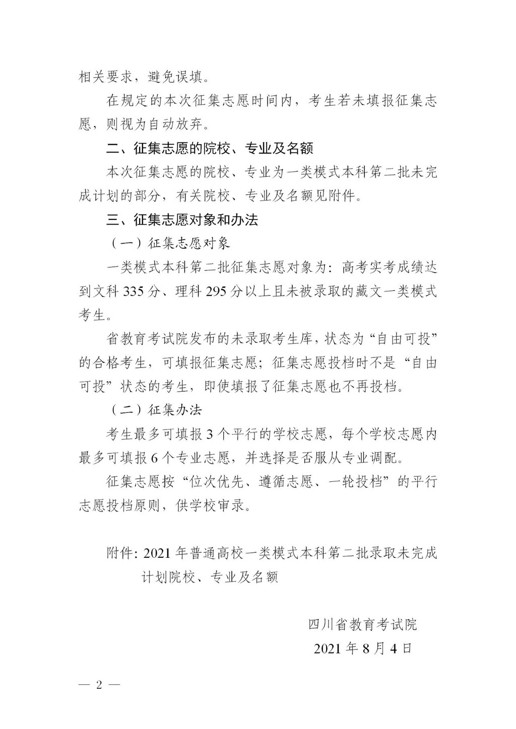 8月4日,记者从省教育考试院获悉,四川将对普通高校一类模式本科第二批未完成计划院校进行征集志愿,时间为8月4日17时至5日10时。