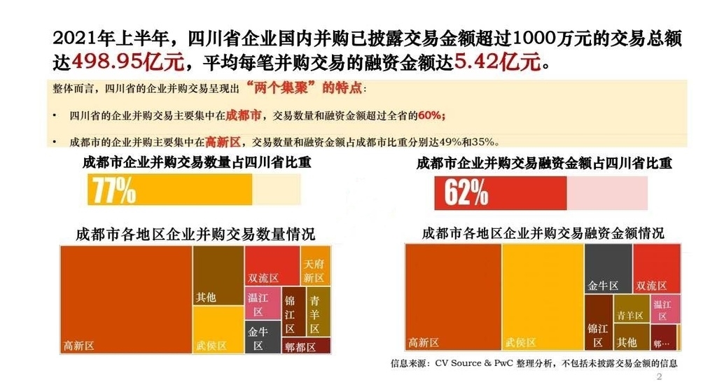 普华永道中国税务及商务咨询西部主管合伙人徐闻表示:“受疫情影响,2021年上半年医疗健康行业发展迅速,该领域在四川省的企业并购融资交易相对活跃,已形成了产业集聚。同时,IT及信息化、高端制造及新经济领域的并购交易也表现亮眼。”