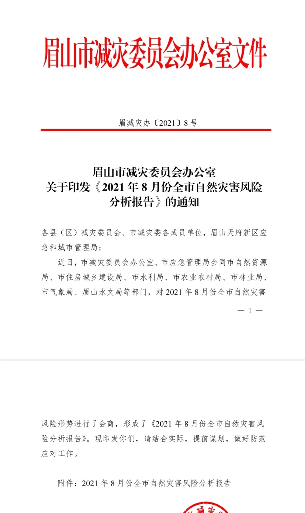 8月3日,记者从眉山市减灾委员会获悉,近日,该委办公室已正式发布《2021年8月份全市自然灾害风险分析报告》(以下简称《报告》),经综合研判,8月份眉山已进入主汛期,部分河流或有中等洪水,部分城区或有内涝,部分地区或将发生地质灾害,对此,各地须重点做好洪涝、地质灾害的防控。