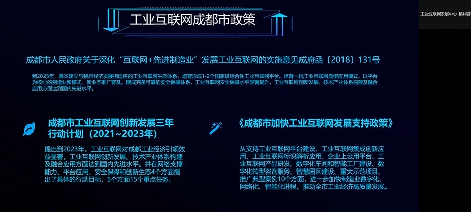 会议上,成都市工业互联网发展中心分别从国家、省市层面梳理了工业互联网政策。自2018年以来,成都陆续出台工业互联网实施意见、行动计划和支持政策。2021年1月,成都市经信局发布了《成都市加快工业互联网发展支持政策》,简称工业互联网成都“十条”,进一步加快制造业数字化、网络化、智能化进程。