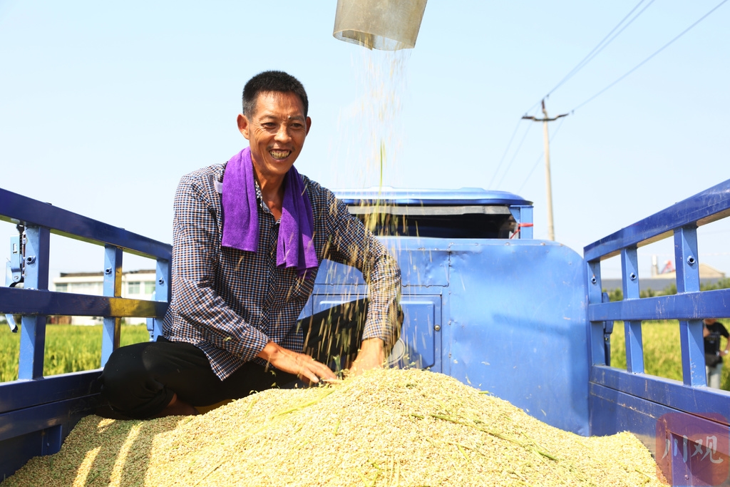 8月4日,在眉山市彭山区公义镇欣荣村2组,村民赵友良抢抓晴好天气,请来联合收割机开始收割承包的300亩水稻。