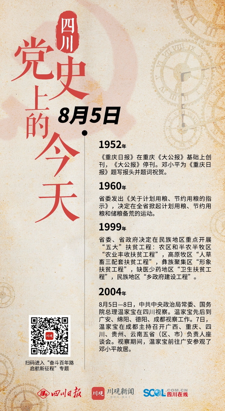 2004年 8月5日—8日,中共中央政治局常委、国务院总理温家宝在四川视察。温家宝先后到广安、绵阳、德阳、成都视察工作。7日,温家宝在成都主持召开广西、重庆、四川、贵州、云南五省(区、市)负责人座谈会。视察期间,温家宝前往广安参观了邓小平故居。
