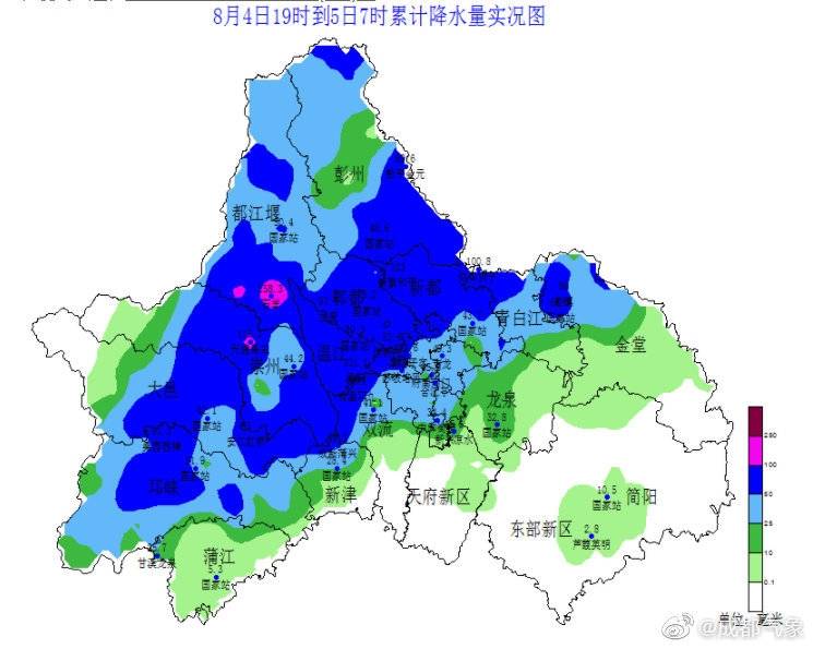 8月4日19时至5日7时,成都市大部分地方出现雷雨天气,强降水集中出现在中西部,最大降水量出现在都江堰石羊158.3毫米;部分地方还有短时阵性大风出现。