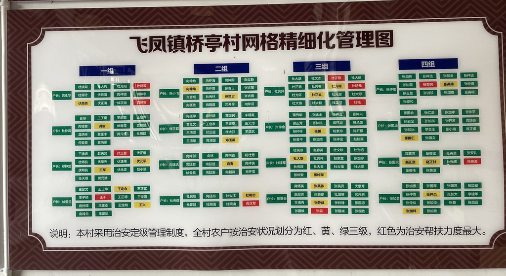 “一户按,十户响。一旦发生紧急情况,装置上的三个键随便按哪个,网格内的所有装置都会响。”飞凤镇党委书记何常清说,桥亭村作为乡村治安环境试点,首先细化了网格,由一村一格细化到10至15户为一个网格,整个村共16个网格。每个网格内,精准识别每户的治安状况,分成红、黄、绿三级。孤寡老人、精神疾病者、残障人士标记为红色,老人孩子在家的为黄色,有青壮年在家的则为绿色。诸如杜明政这样的红色、黄色家庭率先安装了“远程监控”和“一键呼救”设施,并且由村治安中心实时监控。