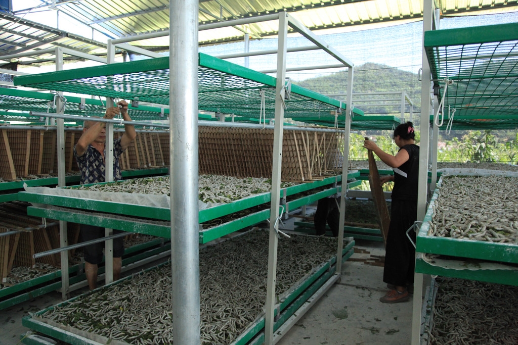 “方格簇要刚好挨着,蚕子才爬的上去,矮了的话要压着,高了又爬不上去,现在自动上蔟的话要方便多了。”李明刚介绍,蚕房于今年4月份建成,占地320平方米,配有天窗、淋水和换气扇,新型蚕具可以容纳20张大蚕,“今年已经喂了4批蚕,现在工人正在准备上蔟,一个星期以后就准备卖鲜茧。”