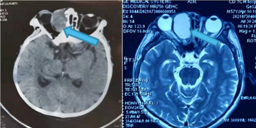 7月31日,格大哥来到成都爱尔眼科医院就诊,经过CT及MRI检查影像显示,眼眶肿物与筛窦相通,局部骨质缺损,眼球受压变形,如不及时治疗,将严重影响他的右眼功能。