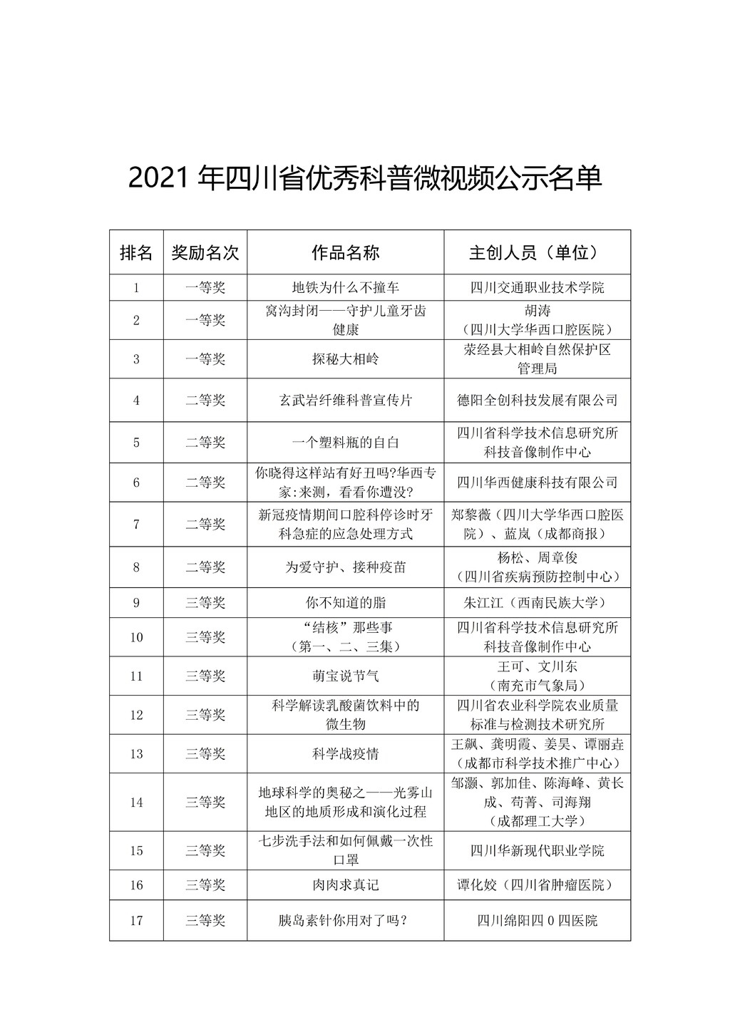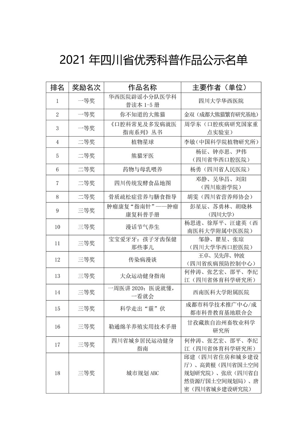 今年,四川首次评选优秀科普作品、优秀科普微视频。8月5日,记者从省科技厅获悉,经过形式审查、专家评审等环节,拟评选2021年四川省优秀科普作品18部、优秀科普微视频28部。