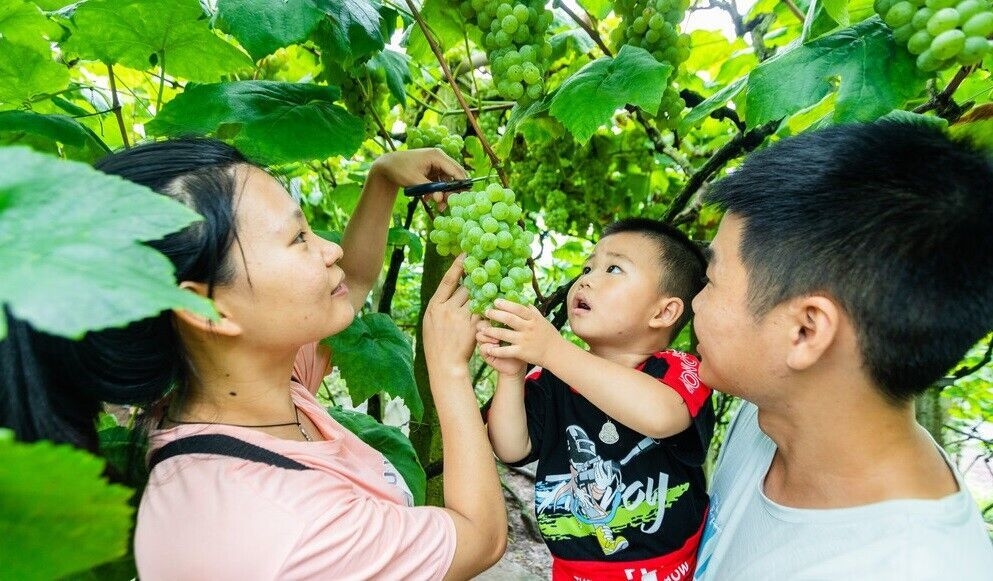 8月5日,在自贡市贡井区成佳镇五四村村民莫洪武的葡萄园里,一排排郁郁葱葱的葡萄架上枝繁叶茂,一串串晶莹剔透的葡萄挂满枝头,散发出阵阵诱人的果香,游客们钻进园里,采摘葡萄。