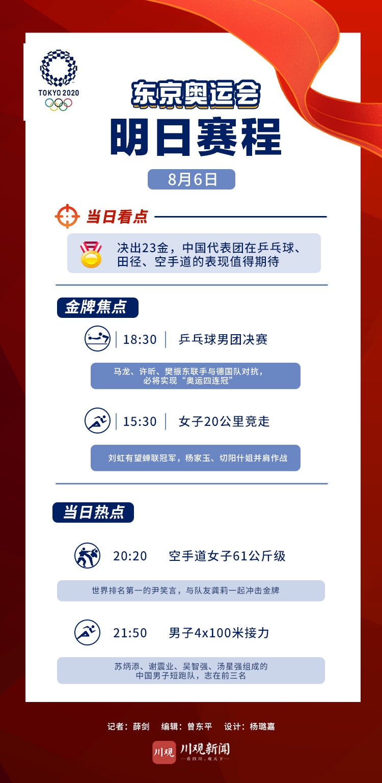 记者今晚继续预测8月6日中国军团的表现,预计中华健儿依旧不会停下揽金摘银的脚步。欢迎朋友们点击标题参与四川在线的竞猜活动,为中国健儿加油:《加入25万人次参与的奥运竞猜 为中国健儿加油赢大奖》