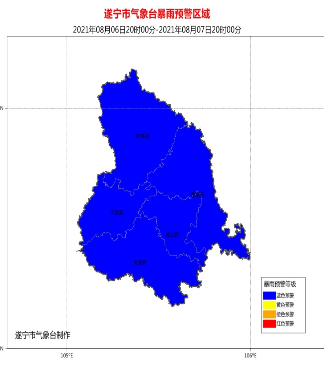 8月6日16时,遂宁市气象台发布暴雨蓝色预警:预计6日20时到7日20时,遂宁射洪、大英、船山、安居、蓬溪部分地方有暴雨(雨量50~70毫米),个别乡镇雨量可达100毫米以上,并伴有雷电和短时阵性大风,请注意防范。