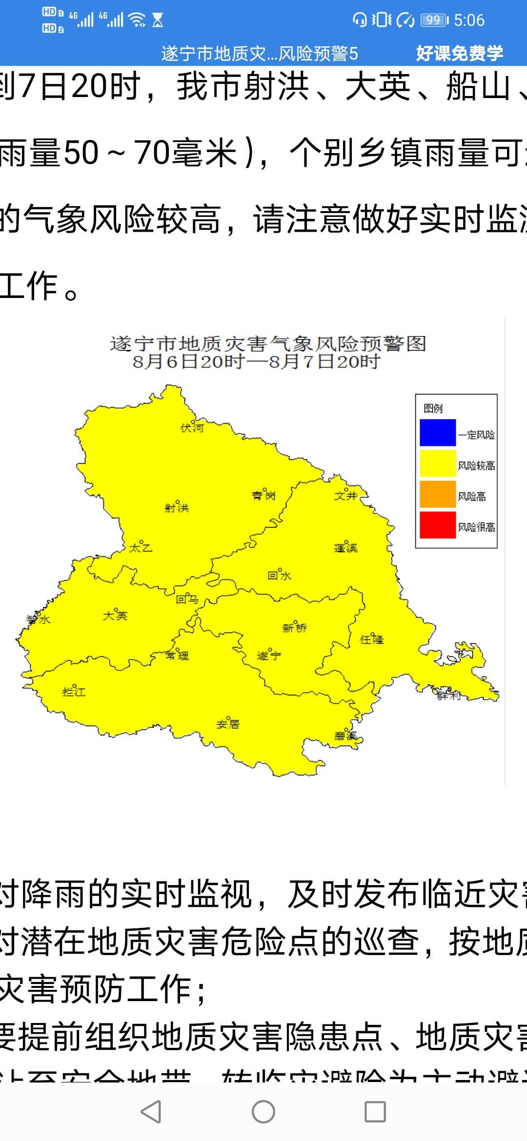 8月6日16时30分,遂宁市自然资源和规划局与遂宁市气象局联合发布地质灾害气象风险预警:预计6日20时到7日20时,遂宁射洪、大英、船山、安居、蓬溪部分地方有暴雨(雨量50~70毫米),个别乡镇雨量可达100毫米以上,发生地质灾害的气象风险较高,请注意做好实时监测、防汛预警和转移避险等防范工作。