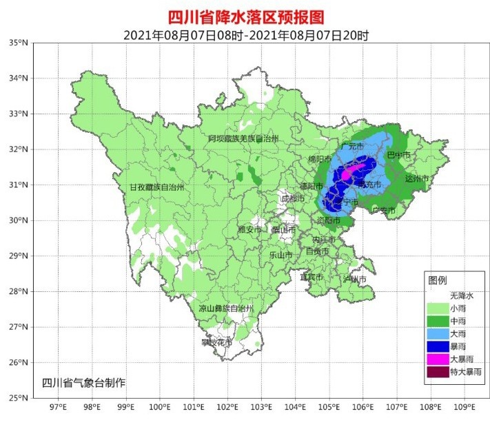 8日白天到晚上,巴中、达州、广安、宜宾、泸州5市和雅安、乐山2市南部及广元市北部、南充市东部阴天有大雨到暴雨,部分地方有大暴雨,盆地其余各市阴天间多云有阵雨或雷雨,雨量小到中雨;川西高原阴天间多云有阵雨或雷雨,其中甘孜州东部和阿坝州部分地方有中雨;攀西地区以阴天为主,雨量普遍小到中雨,其中凉山州东北部有大雨,局部地方有暴雨。