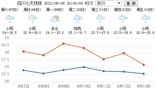 四川省气象台预计,未来7天,全省日平均气温总体呈下降趋势,日平均最高气温25.9℃~33.2℃。