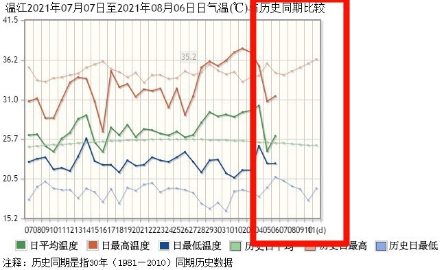 根据温江国家基准站的历史数据,可以看到,1981年至2010年之间,从8月8日开始,日最高气温出现了明显抬升,但由于夜晚比较凉爽,日平均气温是逐日下降的。