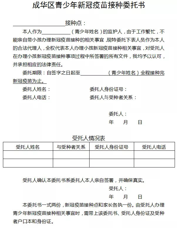 青少年须在法定监护人的陪同下接种(若监护人无法到场则需签署并携带成华区青少年新冠疫苗接种委托书,委托其他非直系亲属现场陪同)。受种者请携带身份证和户口簿(建议最好带上预防接种证)。
