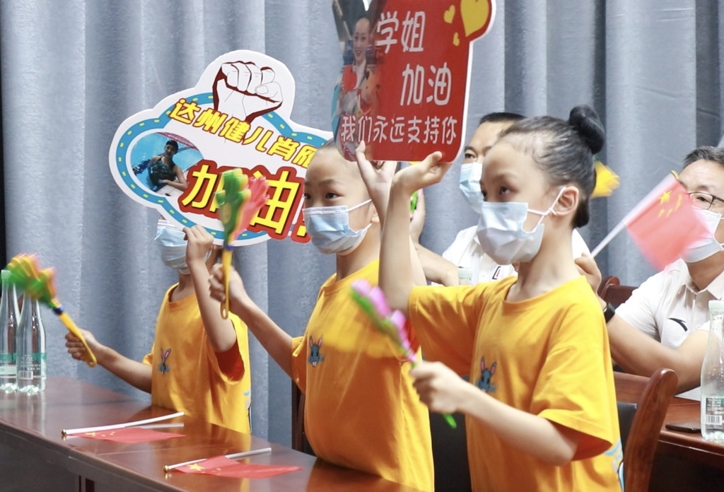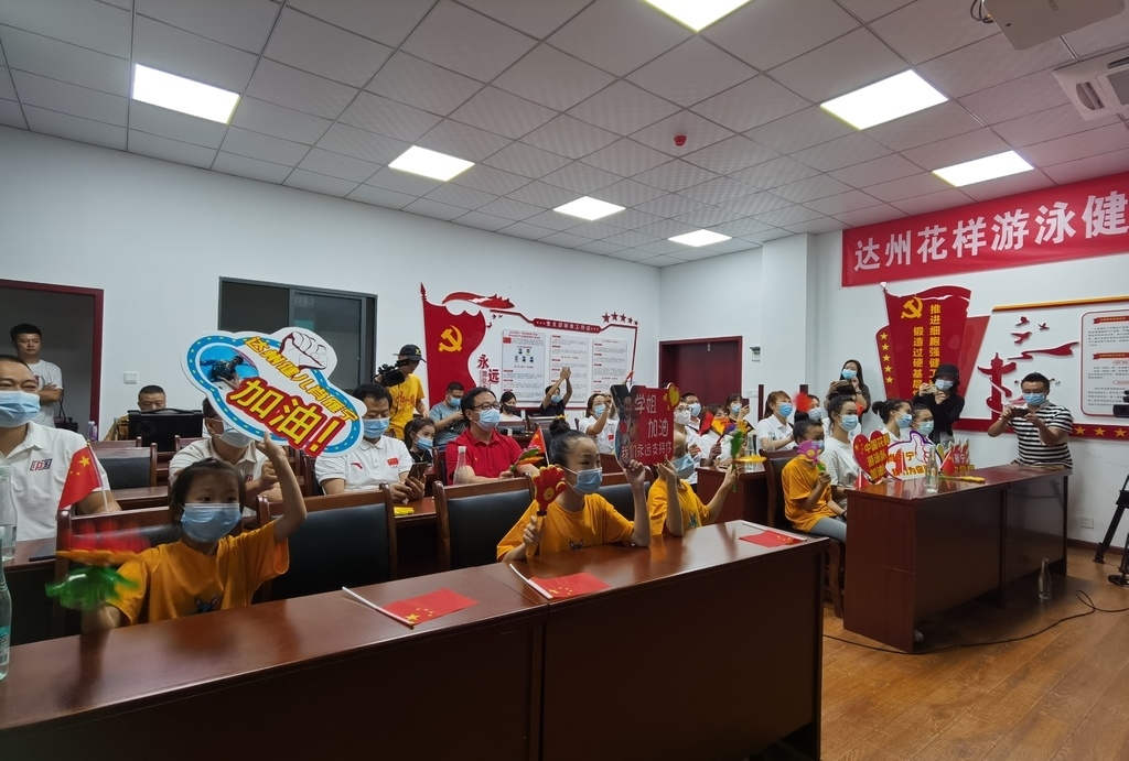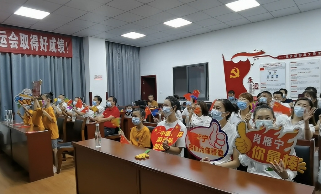 在会议室内,拉上了“预祝中国花样游泳队东京奥运取得好成绩!”“达州花样游泳健儿肖雁宁加油!”的横幅,还准备了小红旗、拍手器,足见浓厚的氛围。