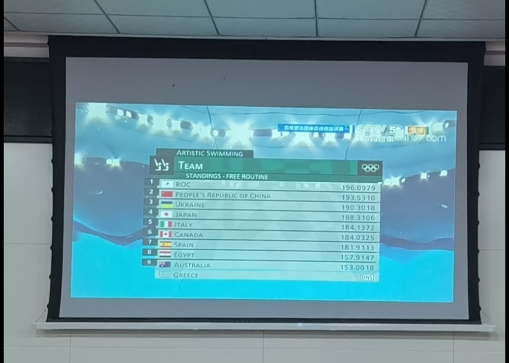 比赛开始,众人认真观看其他代表队的表现及成绩,计算着是否能给中国队带来压力。根据比赛顺序,中国花样游泳队被安排在最后一个登场。