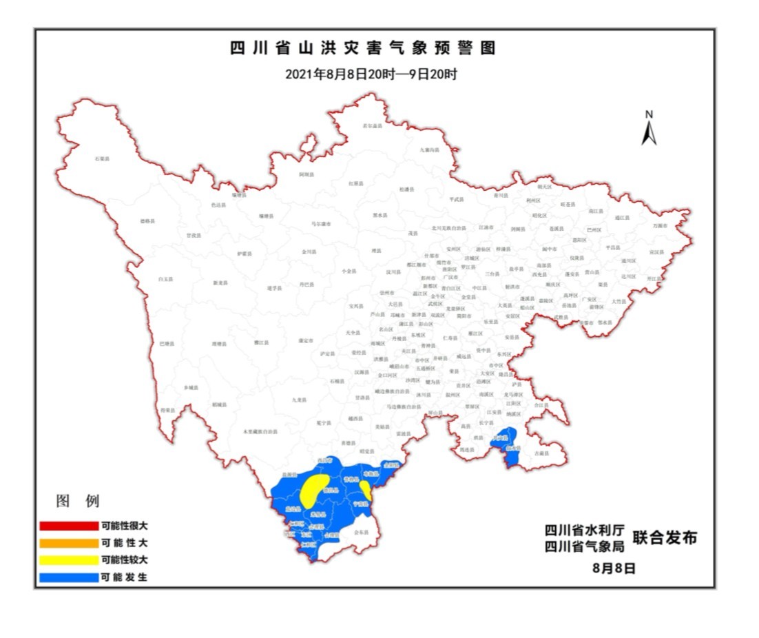 8月8日17时,四川省水利厅、四川省气象局继续联合发布山洪灾害黄色预警。8日20时至9日20时,盐边、米易、德昌、西昌、盐源、布拖、宁南、普格等县(市、区)发生山洪灾害可能性较大(黄色);仁和、东区、西区、金阳、会理、叙永、兴文等县(市、区)可能发生山洪灾害(蓝色)。