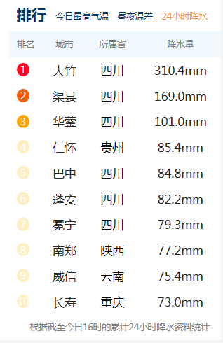截至8日16时,在全国24小时累计降水量排行榜上,四川共摘得6席,全国前三名分别为大竹、渠县、华蓥。