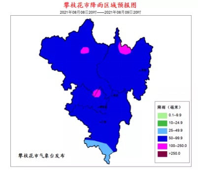 8月8日16时,攀枝花市气象台发布暴雨蓝色预警,预计8日晚上到9日白天攀枝花市全域将出现一次暴雨天气过程,个别地方有大暴雨,大部地区雨量50-70毫米,其中盐边红宝、米易麻陇、仁和务本、同德可达100毫米以上,最大小时降雨量40-60毫米。过程可能伴有雷电、大风和冰雹等强对流天气。
