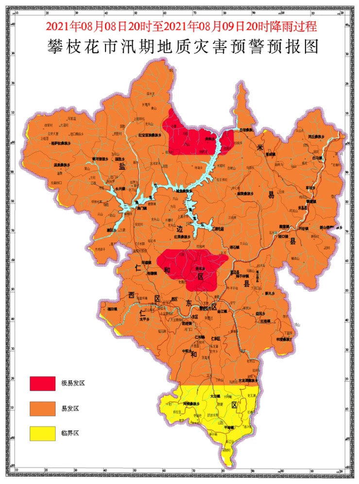 根据气象预报信息分析,攀枝花市仁和区大龙潭、平地、啊喇、大田等地区发生地质灾害的风险较高(黄色预警);东区、西区、仁和区,米易湾丘、白马、草场、普威,盐边县共和、渔门、格萨拉、国胜等地部分区域发生地质灾害的风险高(橙色预警),仁和区务本乡,布德镇、同德镇、盐边县红宝彝族乡米易县麻陇彝族乡发生地质灾害的风险极高(红色预警)容易诱发滑坡、崩塌、泥石流等地质灾害。