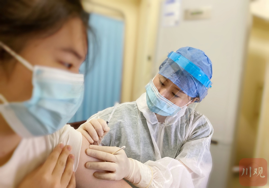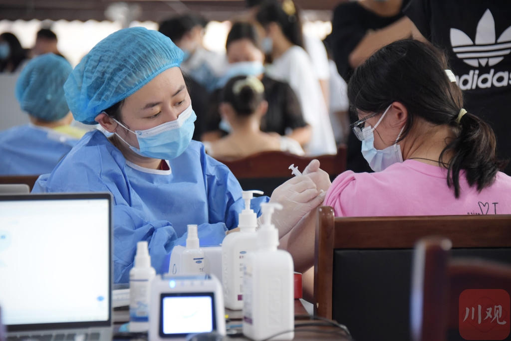 ▲8月5日,成都市第三人民医院疫苗接种点,医务人员为12-17岁青少年进行疫苗接种。