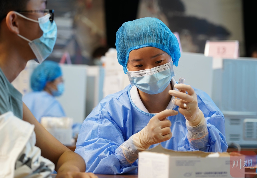8月7日,成都市妇女儿童中心医院新冠疫苗接种点的接种护士黎菲正严格按照接种标准流程为市民接种疫苗。核对接种人员信息、开盒、取苗、抠盖、抽取、消毒、注射……这套动作护士们每天要重复上百次。该接种点的负责人唐琴告诉记者,目前该院每天开设5个接种室,能同时为12-17岁青少年开展接种服务。接种室护士平均每人每天要完成约260人次的疫苗接种,每日医院将完成大约1300余剂次的接种。