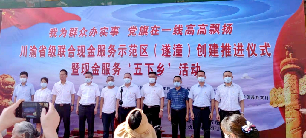 为着力推进成渝毗邻地区现金服务区示范创建工作,近日,由中国人民银行遂宁中支、中国人民银行合川中支、中国人民银行蓬溪县支行和蓬溪县金融办联合主办的“川渝省级联合现金服务示范区(遂潼)创建推进仪式暨现金服务‘五下乡’活动”在中国邮政储蓄银行蓬溪县蓬南镇支行举办。