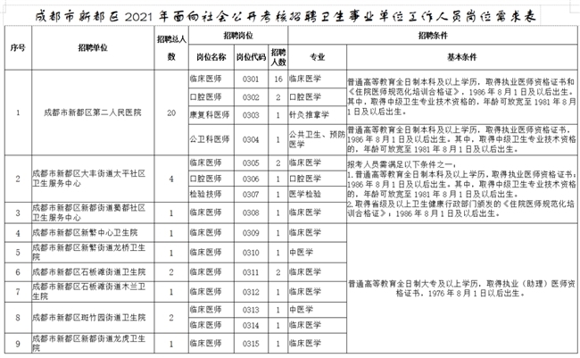 按照成都市事业单位公开招聘工作年度计划安排,2021年3季度,成都市经信局、科技局、司法局、卫健委、市场监管局、体育局、网络理政办、贸促会、市委党校9个市级部门(单位),成都高新区、锦江区、金牛区、武侯区、成华区、龙泉驿区、青白江区、新都区、温江区、郫都区、新津区、简阳市、都江堰市、彭州市、邛崃市、金堂县、大邑县17个区(市)县拟组织面向社会公开招聘(考试、考核、选调)事业单位工作人员961名。