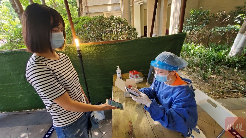和黄俏俏一样凌晨5点到岗的还有成都市第一人民医院血液科的濮迁。“我今天本来是轮休,临时接到电话就赶过来了,我们第一批过来的同事4点就到了。”记者了解到,根据健康码的颜色不同,市民会分别在四个检测台进行检测。“我们这个检测台只检测绿码,黄码的市民就在旁边的检测台。”