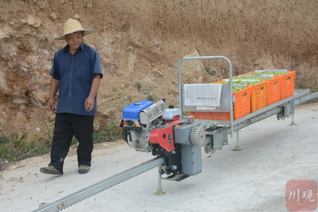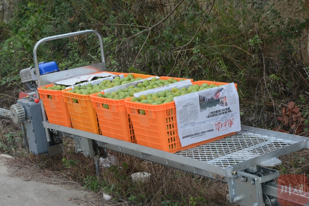 “这个田间小轻轨太方便了,只需要一个人在果园上货,少数人在棚子里卸货就够了,单次载重可达500斤!家里人手不够,有了这台机器真的让我省了很多时间。”正在选果棚忙碌的果农杨树兵激动地说。