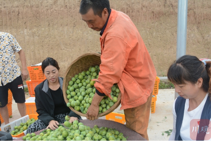 “哒哒哒……”伴随着一阵阵柴油发动机的轰鸣声响起,沿着山坡迎面驶来一辆无人驾驶的小轻轨运输车,满载着刚采摘好的水果,不到几分钟就稳稳当当停靠在了村里的选果棚,果农们随即将李子卸下后开始二次分拣和筛选,再就近销售给特地来村采收鲜果的外地客商。8月10日,四川在线记者在阿坝州汶川县绵虒镇玉龙村看到的这一幕。