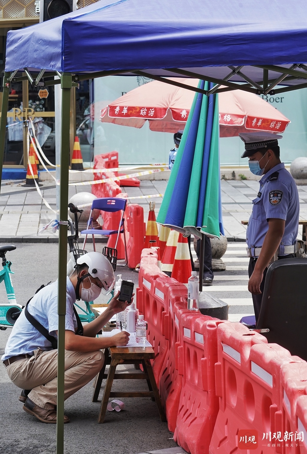 成都市青羊区优品道曦岸解封前,外围第一道关口,午间送外卖的小哥逐一登记进入