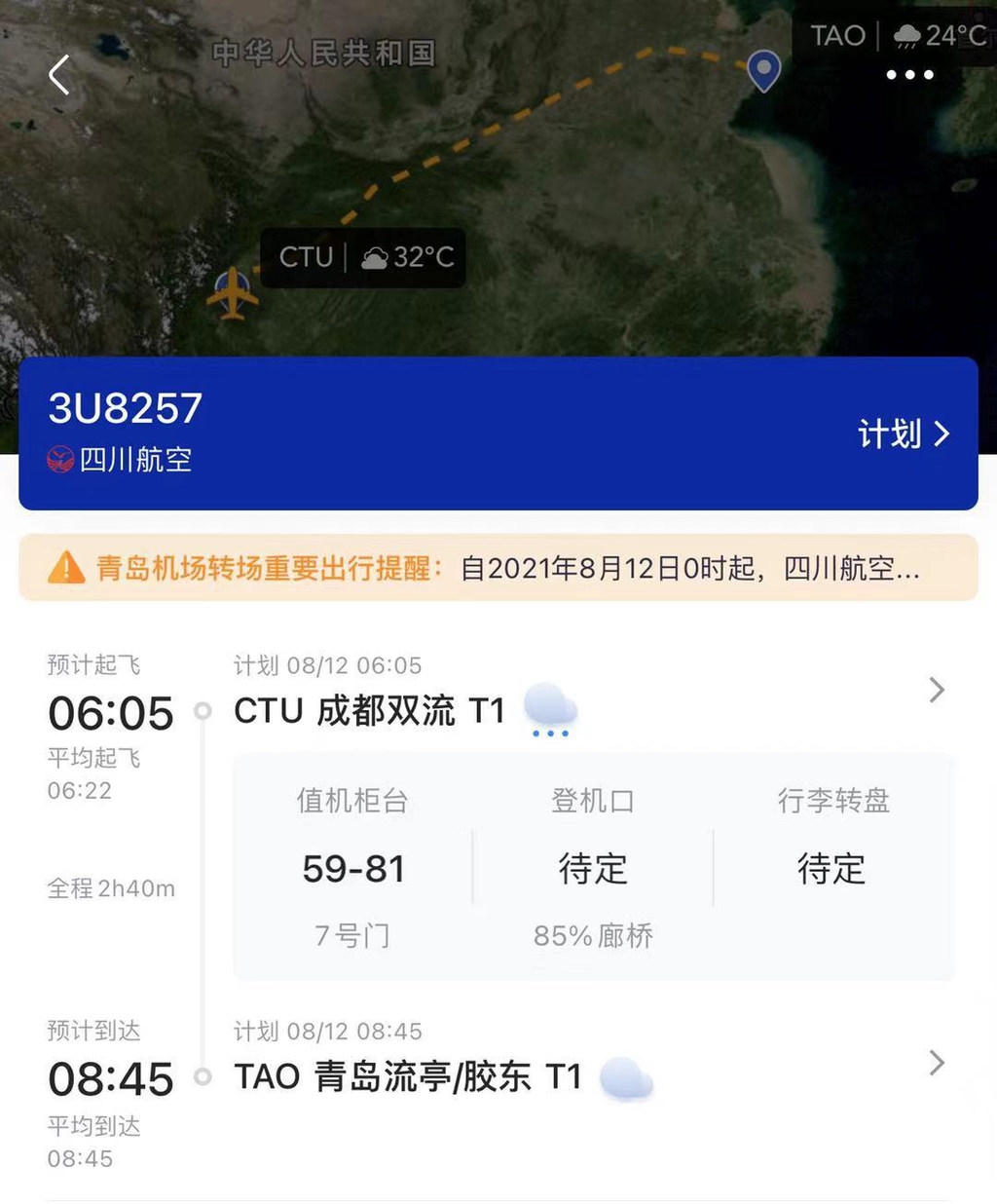 @飞客,明天(8月12日)起飞往青岛,将在新机场落地了!青岛胶东国际机场将于明日0时起正式启用,已运行39年的青岛流亭国际机场也将同步关闭。根据航班管家机场大屏显示,四川航空3U8257航班(成都双流-青岛胶东)将是青岛胶东机场启用后第一个进港航班,计划于8:45分落地胶东机场。