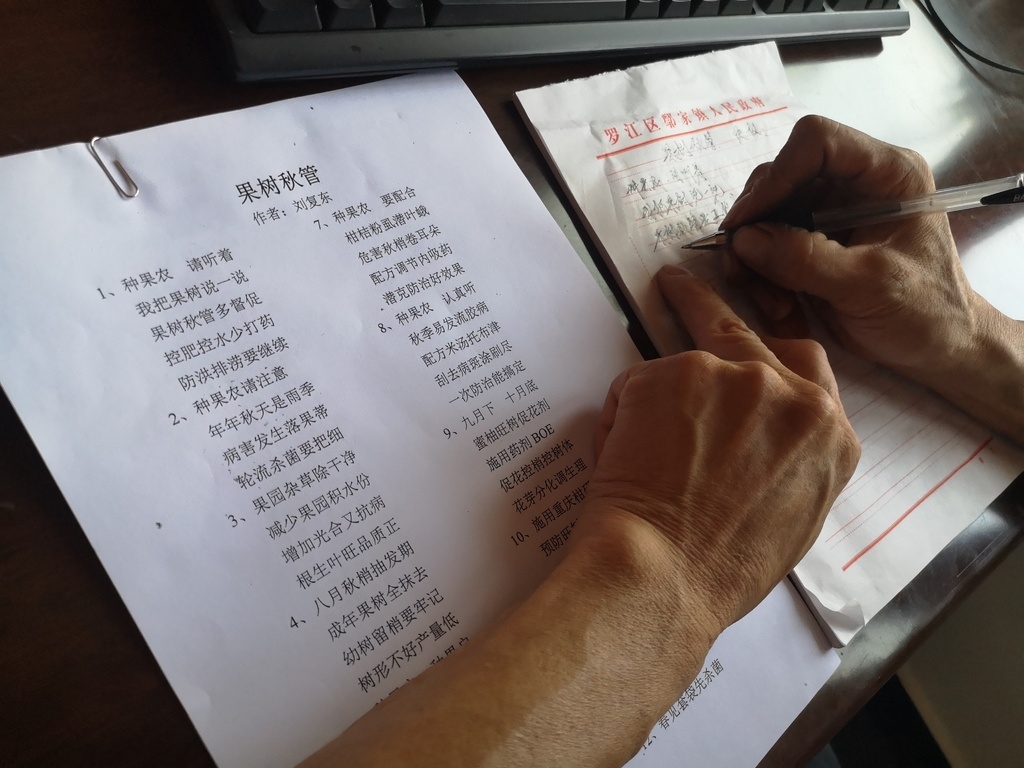 “有人说我是‘农民诗人’,但我的作品没有风花雪月,它们来源于生产生活,又服务于生产生活。”刘复东让自己的“种果经”,回荡在鄢家镇的田间地头:果农们/请听着/听我来把果树说/果树管理是工作/实用技术要多学……