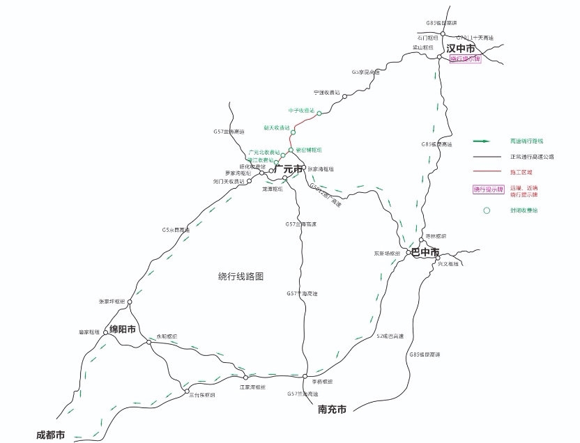 G5京昆高速公路进川方向广元收费站至川陕界路段实行封闭施工,关闭京昆高速公路中子站、朝天站、广元站以及广元绕城高速上西站等4个收费站往绵阳方向进站车道,关闭广元绕城高速瓷窑铺枢纽往绵阳方向匝道,所有车辆借用其它道路绕行。